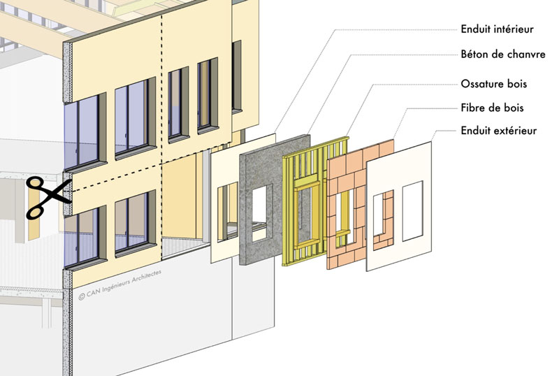 Les services Informatique et QSE de Triballat Entreprise agroalimentaire familiale spécialisée dans les domaines du bio, du végétal dont le chanvre, des fromages et de la nutrition) basé à Noyal-sur-Vilaine (35), sont maintenant installés dans un bâtiment en béton de chanvre. A la clé : confort thermique, hygrométrique, sanitaire et acoustique. Quentin Pichon de l’agence CAN-ia a assuré une partie de la maîtrise d'œuvre et d’éxécution, en collaboration avec Christophe Lubert de LB Eco Habitat. 31 panneaux d’une hauteur d’un étage ont été préfabriqués dans l’atelier LB Eco Habitat de Bédée (35) avec une ossature bois et 28 cm en béton de chanvre. « C’est le premier chantier de cette envergure en préfabriqués », précise Christophe Lubert. « Cela a permis 20 à 30 % d’économie (temps de séchage, matière première...) comparé au béton projeté sur chantier. » Pour la toiture, 37 cm de béton léger (70 kg /m²) ont été projetés sur place. Le bâtiment est conforme au Label E+C- et en cours de labellisation BBCA. « Il a coûté moins de 3 % de plus qu’une solution conventionnelle », souligne Quentin Pichon. « Mais les économies de climatisation et de chauffage rééquilibrent le budget. »