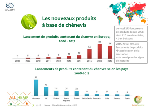 Selon EcoZept, bureau d’études franco-allemand missionné par InterChanvre et intervenant au congrès All Hemp, plusieurs tendances alimentaires au niveau mondial soutiennent la croissance des surfaces de chanvre : la recherche de produits sans gluten, de produits crus, riches en protéines, super-food... Le développement de nouveaux produits à base de chanvre s’est amorcé depuis 2008, avec une accélération à partir de 2013, pour atteindre un sommet en 2016. En Europe, l’innovation a vraiment explosé depuis 2015, avec l’Allemagne comme pays largement leader alors que sa production est faible (3 100 ha). 56 % du chènevis européen est dédié à l’alimentation humaine. La France cultive 16 400