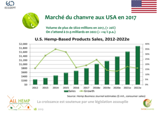 La production de chanvre aux USA a été jugulée par le système des licences par État. En 2018, 41 Etats l’autorisaient mais elle se concentrait cependant sur deux ou trois d’entre eux, avec une forte hausse de production entre 2017 et 2018 (+ 213 %). Le pays est le plus gros importateur de produits à base de chanvre dans le monde (90 % en provenance du Canada). Mais les volumes importés reculent depuis 2015 en raison de la hausse des surfaces, hausse qui devrait se poursuivre. En effet, depuis le 11 décembre 2018, le chanvre est considéré comme une culture agricole banale et non plus contrôlée ! Les USA seront ainsi bientôt en mesure d’exporter. Le chiffre d’affaires des ventes de produits à base de chanvre s’élève à 722 M€ (en 2017) dont 23 % pour un usage thérapeutique (CBD), 22 % en cosmétique, 17 % en alimentation humaine. Le chanvre est considéré comme un super-food aux USA et le bio tire aussi le marché. La qualité des protéines et leur taux élevé constituent des arguments spécifiques de vente.