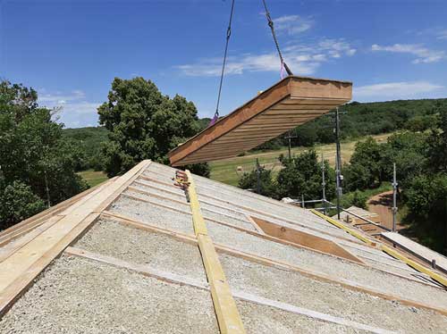Nouvelle avancée pour la préfabrication en béton de chanvre avec la réalisation de la première toiture (80 m² sur 4 pentes) par l’entreprise Burg sur une maison d’habitation dans le Tarn et Garonne. « Dans notre région, les températures élevées en été rendent les combles isolées classiquement peu habitables sans climatisation », précise Dominique Burg, habitué au béton de chanvre. « C’est pour cette raison que j’ai proposé le béton de chanvre à ce client qui ne souhaitait pas de climatisation. » Une toiture en béton de chanvre nécessite des panneaux plus isolants et plus légers que des panneaux de murs. La charpente doit être un peu plus renforcée que pour une toiture classique. Dominique Burg, qui a aussi testé le béton de chanvre projeté, a finalement choisi la préfabrication pour ses multiples avantages. « La toiture est réalisée à l’abri dans les meilleures conditions et se monte très vite sur le chantier, mettant ainsi le bâtiment hors d’eau plus rapidement qu’une toiture classique. La préfabrication permet de gérer le séchage plus sereinement ; les autres corps de métiers peuvent ainsi intervenir très vite après la pose. Cette technique réduit aussi les risques sur le chantier vis-à-vis des ouvriers (moins de salariés en hauteur). »
