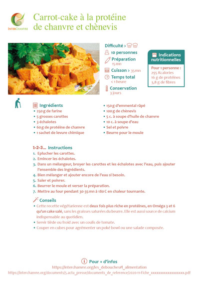 Cinq semaines de menus pour la restauration collective (scolaires et seniors) contenant des recettes utilisant le chanvre (huile, graines, protéines) ont été élaborées par le docteur en nutrition Béatrice de Reynal pour InterChanvre. Ces menus accompagnés de quinze recettes complètes intégrant du chanvre et des recommandations pour les diététiciennes ont été envoyés en février à toutes les chanvrières. Objectif : apporter des solutions aux collectivités locales pour la mise en application de la loi Egalim au 1er janvier 2022. Les chanvrières n'ont plus qu'à proposer ces menus et recettes sur leur territoire pour développer une restauration collective saine et locale. Exemples de recettes : nuggets de blé, petits pois, lentilles corail au chènevis & huile de chanvre, tofu de chanvre, pesto d’ortie au chanvre, chou-fleur au chènevis et huile de chanvre...