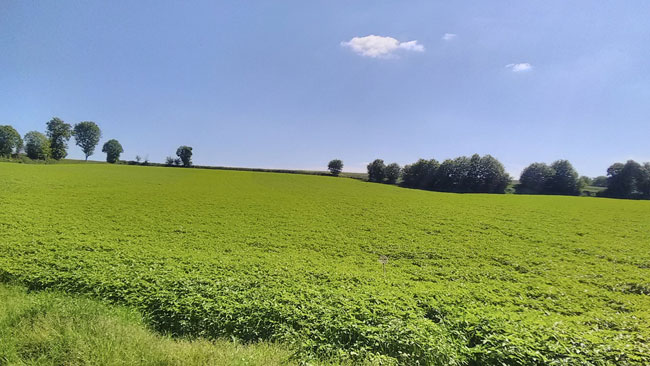 « J'ai semé mon chanvre le 29 avril au lieu de la date habituelle du 8-10 mai car les sols étaient bien réchauffés et une semaine de beau temps était annoncée, ce qui est favorable à une levée rapide », explique Jean-Michel Glémot, producteur en Ille-et-Vilaine pour AgroChanvre. « Du 8-10 mai jusqu'à 26 mai, les petites pluies continuelles et les températures basses ont ensuite stoppé les semis. » Pour que le chanvre puisse lever facilement, la température du sol doit en effet être supérieure à 10 °C. C’était le cas fin avril, mais pas vraiment entre le 8 et le 26 mai, date à laquelle près de 50 % des surfaces n’étaient toujours pas semées. Grâce au beau temps de fin mai, au 1er juin tous les semis étaient terminés en Ille-et-Vilaine et en Mayenne. Chez Jean-Michel Glémot, le chanvre, qui a levé en 5-7 jours, était au stade quatrième paire de feuilles le 26 mai et lui arrivait au genou le 1er juin (photo). « Nous observons également des problèmes récurrents de dégâts de pigeons dans la région. Depuis plusieurs années, j'utilise des sacs bleus suspendus à 1,40 m du sol avec des ballons de baudruche à l'intérieur pour effrayer les pigeons pendant les quatre-cinq jours nécessaires à la levée du chanvre jusqu’à la 1e paire de feuille. »